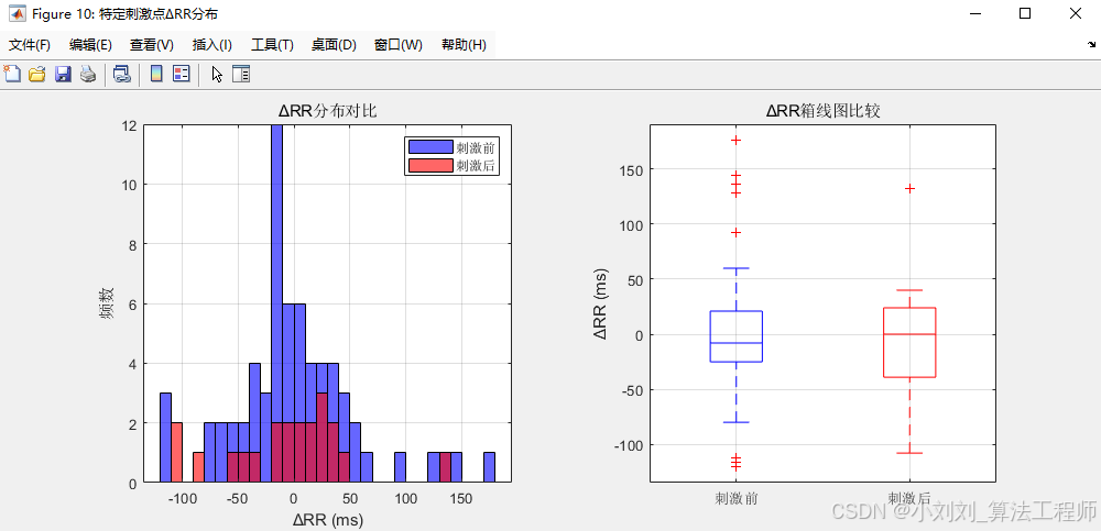 直方图以 ΔRR(ms)为横轴、频数为纵轴,直观呈现刺激前后 ΔRR 序列的频率分布特征: