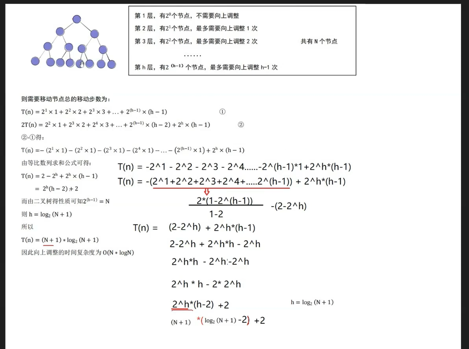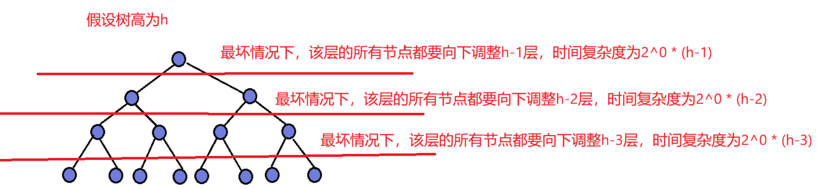 很简单,假设树高为h,每一层的节点的个数N=2^(h-1)个,此时最坏情况下,调整每一个树时都要向下调整到最后一层,如下图
