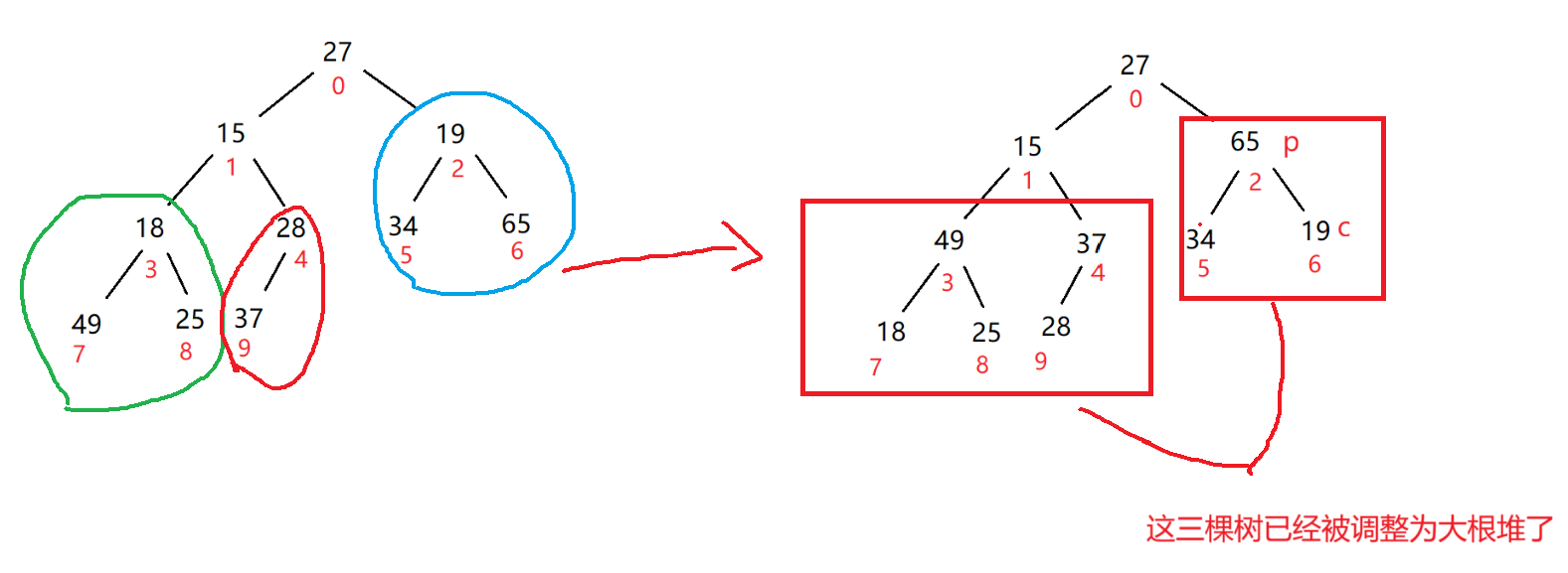 此时让p=c,c=2*p+1即可,c是左右节点中,值最大的那个节点的下标,p是父节点的下标