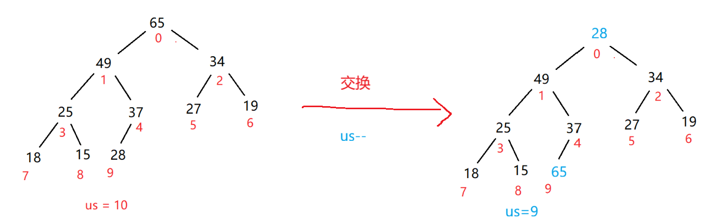 首先,堆的删除就是删除堆顶元素,此时将根节点的值与最后一个树的最后一个节点的值交换,然后让usedSize--,就完成了删除操作,如下图