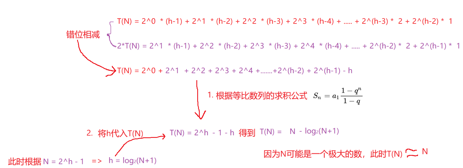 此时只要将h层的结果加起来即可,通过错位相减来求出T(N),如下图
