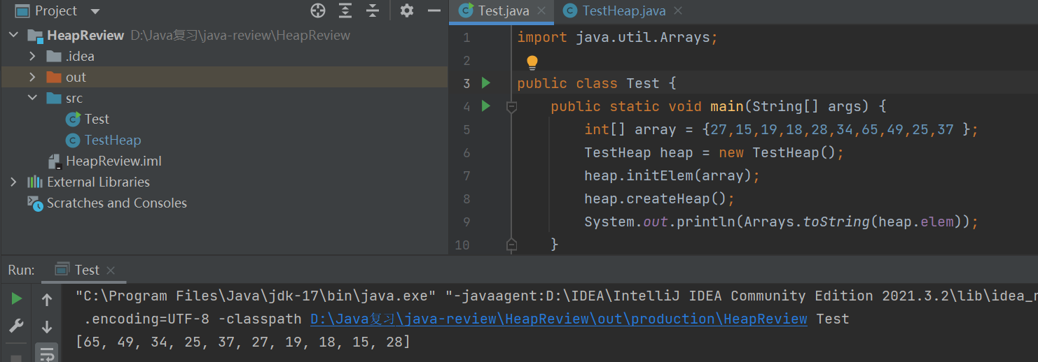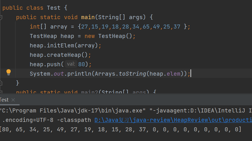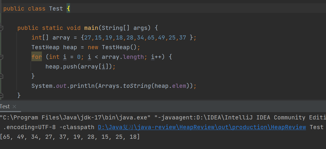 public class TestHeap {public int[] elem;public int usedSize;//堆中的元素个数public TestHeap(){elem = new int[10];}public void initElem(int[] array){for (int i = 0; i < array.length; i++) {this.elem[i] = array[i];this.usedSize++;}}