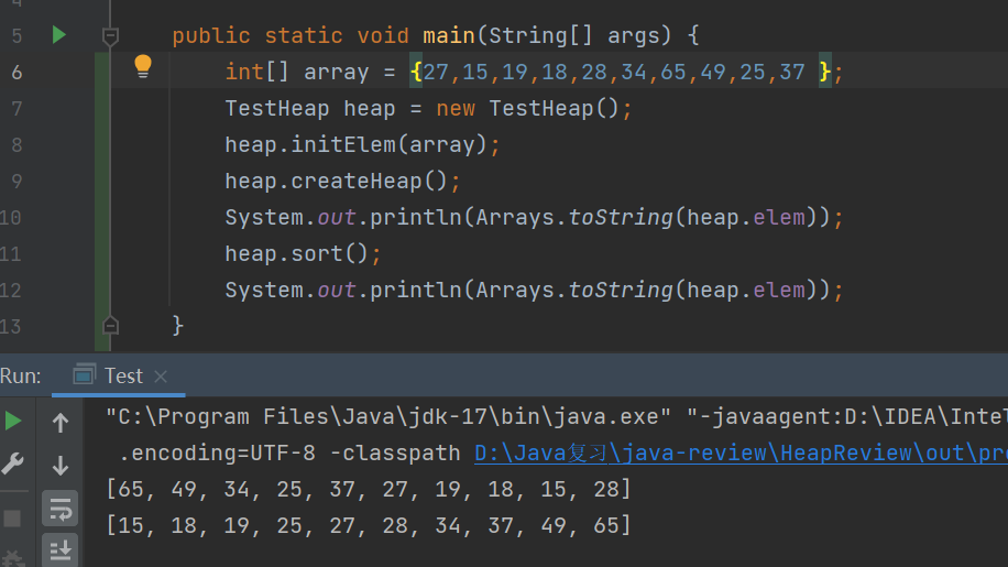 public class TestHeap {public int[] elem;public int usedSize;public TestHeap(){elem = new int[10];}//初始化elempublic void initElem(int[] array){for (int i = 0; i < array.length; i++) {this.elem[i] = array[i];this.usedSize++;}}public void createHeap(){//先找出最后一个树的父节点下标,从最后一棵树开始创建堆//最后一个树的父节点的下标: (usedSize-1-1)/2for (int parent=(usedSize-1-1)/2;parent>=0;parent--){//一个parent代表调整一棵树shiftDown(parent,this.usedSize);}}private void shiftDown(int parent, int usedSize) {int child = parent*2+1;while (child<usedSize){//先找出左右子树的最大值if (child+1<usedSize && elem[child+1]>elem[child]){child=child+1;}if (elem[child]>elem[parent]){swap(elem,child,parent);//交换完,继续向下调整parent=child;child=parent*2+1;} else {break;}}}private void swap(int[] elem, int child, int parent) {int tmp = elem[parent];elem[parent]=elem[child];elem[child]=tmp;}