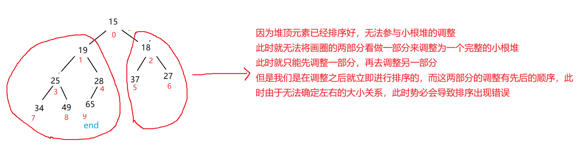 此时可能左边的部分有存在比右边的部分大值,此时先调整左边部分为小根堆去排序的话,此时就会将大的值排在了前面,后续在去调整右边部分为小根堆排序的后,此时就会出现一个较小的值排在较大的值的后面