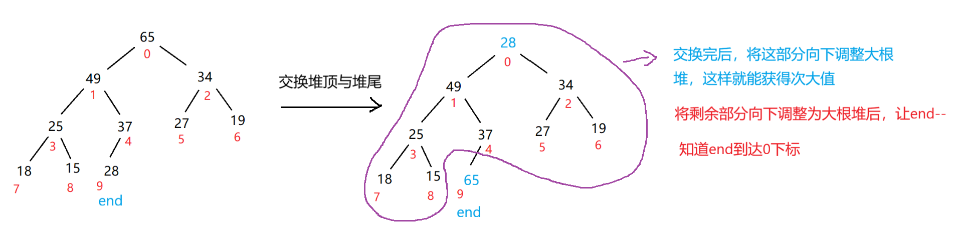 此时发现一个特点,此时只有根节点那棵树不是大根堆,其他的树都是大根堆,所以,此时在交换完值之后,进行依次向下调整为大根堆即可