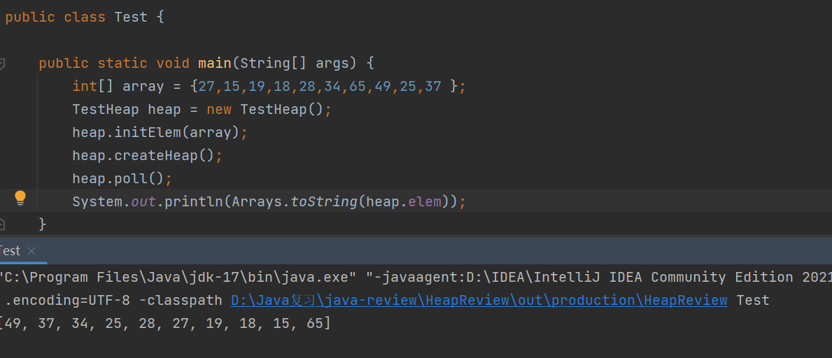 public class TestHeap {public int[] elem;public int usedSize;public TestHeap(){elem = new int[10];}public void initElem(int[] array){for (int i = 0; i < array.length; i++) {this.elem[i] = array[i];this.usedSize++;}}public int poll(){if (isEmpty()){throw new RuntimeException("Heap is Empty");}int val = elem[0];swap(elem,0,usedSize-1);shiftDown(0,usedSize-1);return val;}private boolean isEmpty() {return usedSize==0;}private void shiftDown(int parent, int usedSize) {int child = parent*2+1;while (child<usedSize){//先找出左右子树的最大值if (child+1<usedSize && elem[child+1]>elem[child]){child=child+1;}if (elem[child]>elem[parent]){swap(elem,child,parent);//交换完,继续向下调整parent=child;child=parent*2+1;} else {break;}}}}