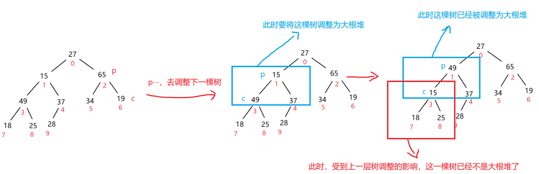这个问题就是:由于是从最后一个树开始调整,如果在这个完全二叉树中,已经将某一层的二叉树都调整为大根堆了,此时让父节点--,此时父节点的位置有可能会跑到上一层去,此时将这一层的树调整为大根堆时,可能会影响到下面的树,此时下面的树就有可能因为上一层的树调整为大根堆后,下面的树就不是大根堆