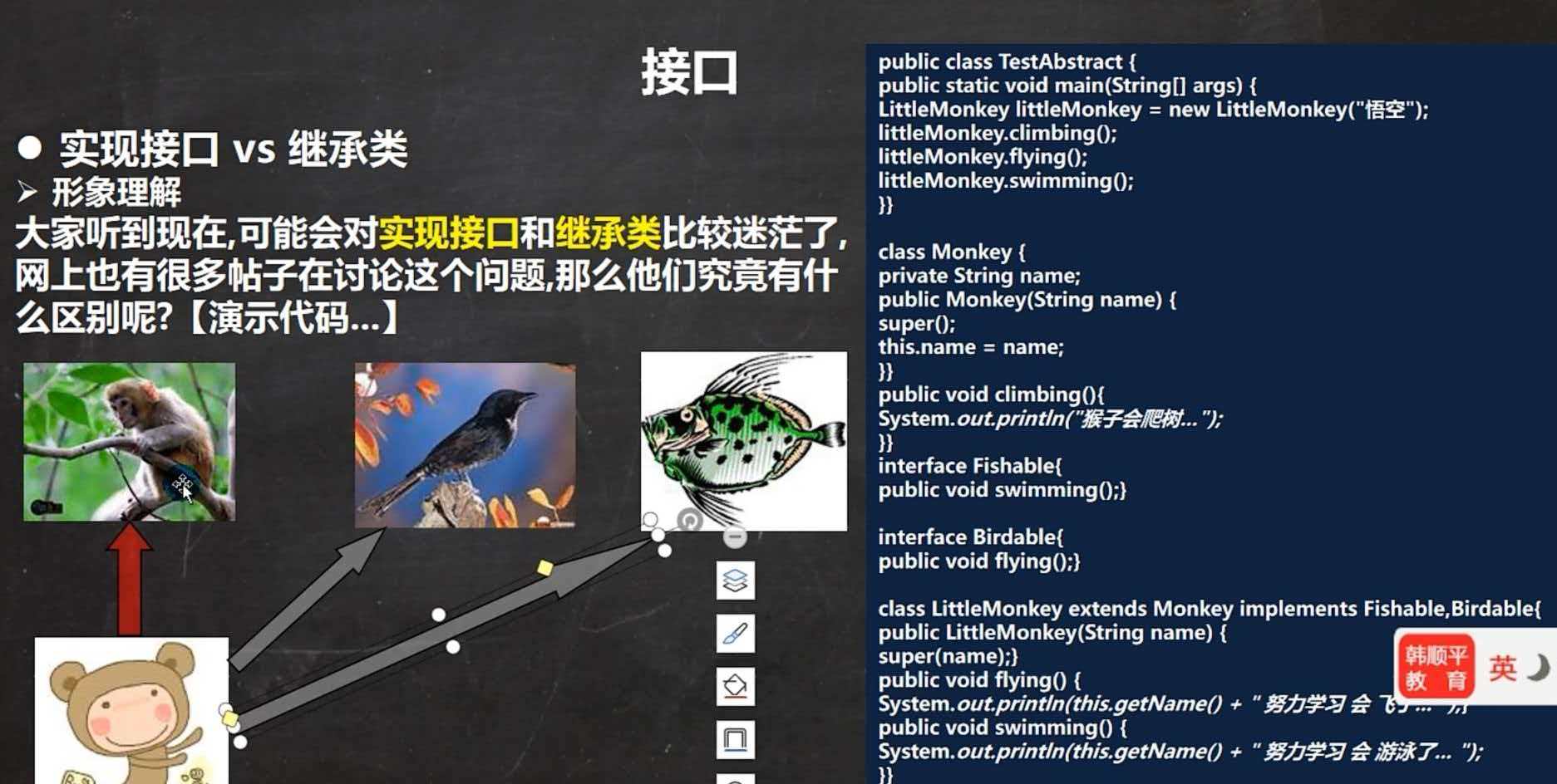 class LittleMonkey extends Monkey implements Fishable,Birdable{//类只能继承一个类,不能继承别的类public LittleMonkey(String name) {super(name);}@Overridepublic void swimming() {System.out.println(getName() + "通过学习,像鱼儿一样游泳");}@Overridepublic void flying() {System.out.println("通过学习,像鸟儿一样飞翔");}