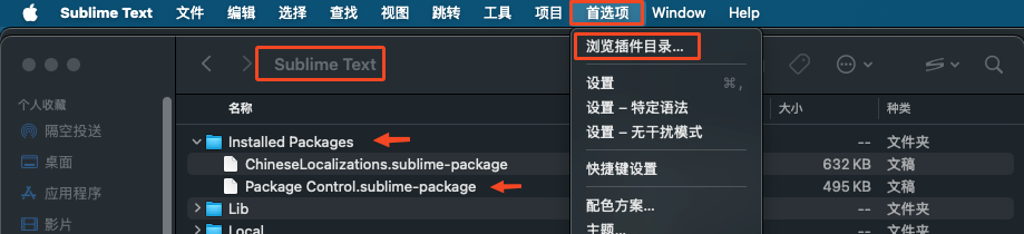 首先,【首选项】——【浏览插件目录】在弹出的文件窗口中返回上一级,到“Sublime Text”文件夹下,找到“Installed Packages”文件夹,确保文件夹内有Package Control: Install Package文件,如果没有可以网上找一个放进去(上传一个自用资源)。