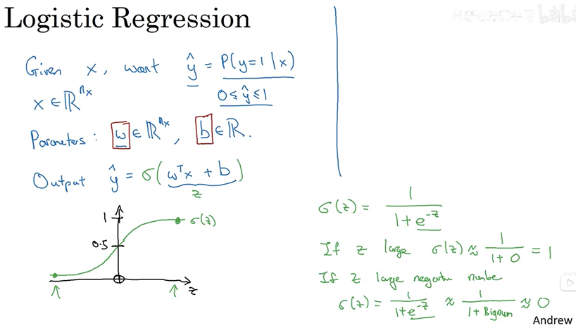 这是一个学习算法,用于监督学习问题中,输出y标签是1或0时,二元分类问题。已知的输入特征向量x可能是一张图,你希望把识别出这是不是猫猫图。需要一个算法,可以给出一个预测值,,就是我们对y的预测,更正式来说,
