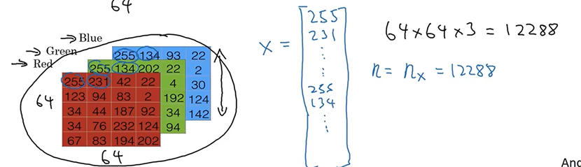 计算机保存一张图片,需要三个独立矩阵,分别对应红、绿、蓝三个颜色的通道,如果输入图片是64×64像素,就有3个64×64的矩阵,为了更方便举例子,这里用三个5×4的小矩阵代替64×64的矩阵。把这些像素值都提取出来,放在一个特征向量x中(feature vector x),步骤是先列出所有的红色像素,比如255、231等,接着是绿色像素255、134等,最后得到一个非常长的特征向量。如果图片是64×64像素,那么向量x的总长度就是64×64×3。对于这个例子,向量x的总长度是12288,用nx=12288来表示输入的特征向量x的维度,有时候为了简洁,也会用n来表述输入向量的维度。