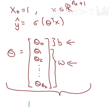 在继续之前(moving on),我们再讲一讲符号约定,当我们在神经网络编程时,通常会把w和b分开,在一些符号约定中,会定义一个额外的特征向量,叫x0,等于1,所以现在x就是