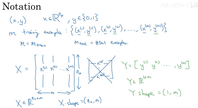 在二分类的问题中,它以图片的特征向量x作为输入,预测输出结果标签为1还是0,也就是预测图中是否有猫猫。现在,看看后面课程中需要用到的一些符号。