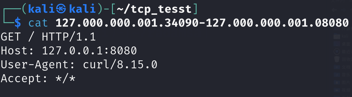 这时候,tcpflow终端会显示捕获到的流量,当前目录会生成一个127.000.000.001.53554-127.000.000.001.08080 的文件(文件名可能不同,取决于客户端端口),该文件就是包含正常 HTTP 请求的原始样本。