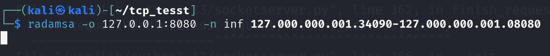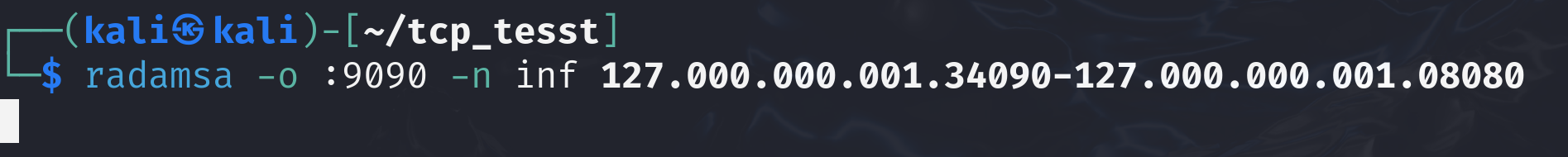 radamsa -o :9090 -n inf 127.000.000.001.34090-127.000.000.001.08080