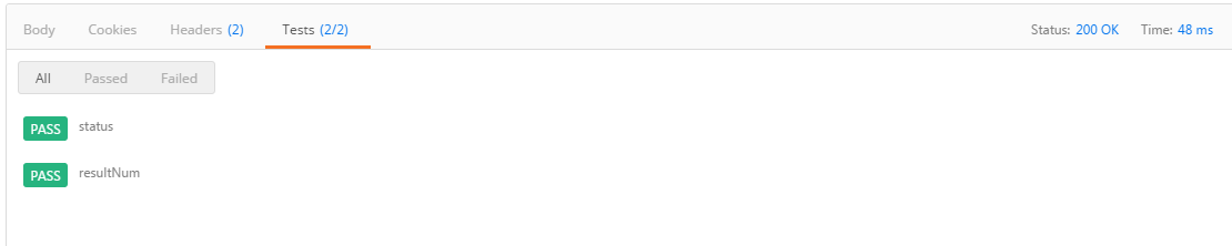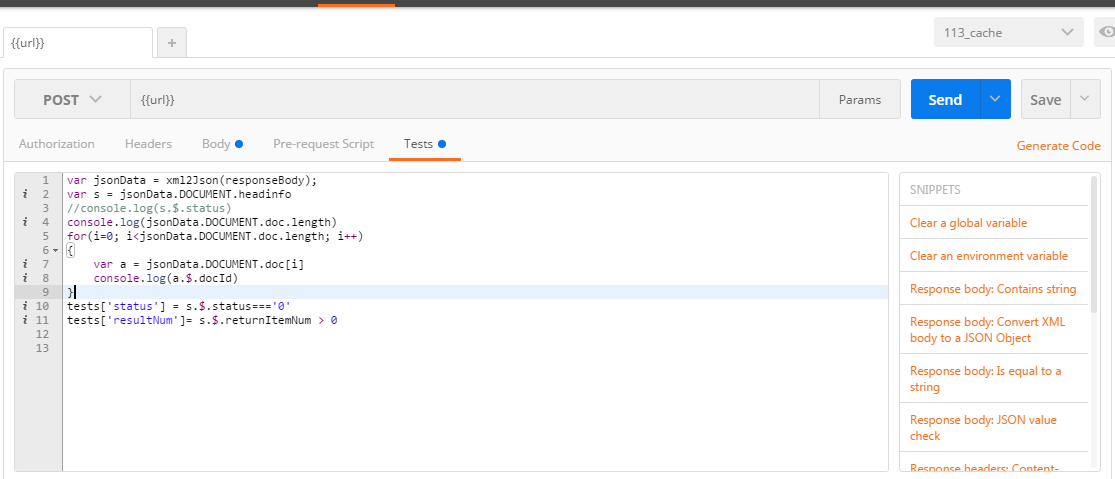 我要验证的是headinfo里的status=0和returnNum>0,下面是test的结果,说明测试通过,这时再回头看Tests中的内容就会发现,tests['status'] = s.$.status==='0'中tests['status'] 被赋成s.$.status==='0',若s.$.status==='0'为true,则case通过,否则fail,就是这么简单,其实主要的关键就是要找到你的验证点,如果只验证返回code,直接用右侧的snipplets中的