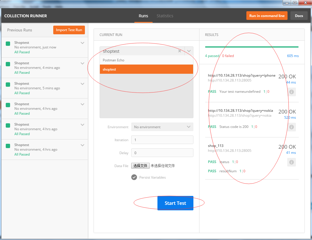 有了上面这些方法,再复杂的接口测试我们都能搞定,然后就是把设计好的case都放在一个collection中,就是类似于testsuite,然后点击左上角的Runner来执行collection