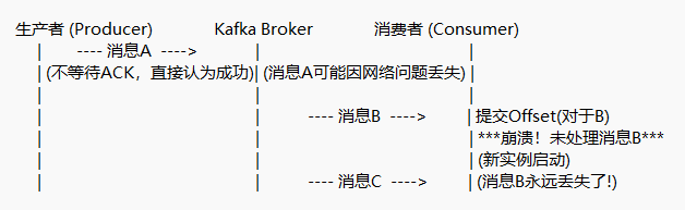 | 至多一次 | 不等待ACK,不重试 | 先提交Offset,后处理 | 吞吐量高,无重复 | 可能丢失数据 | 日志、metrics收集 |