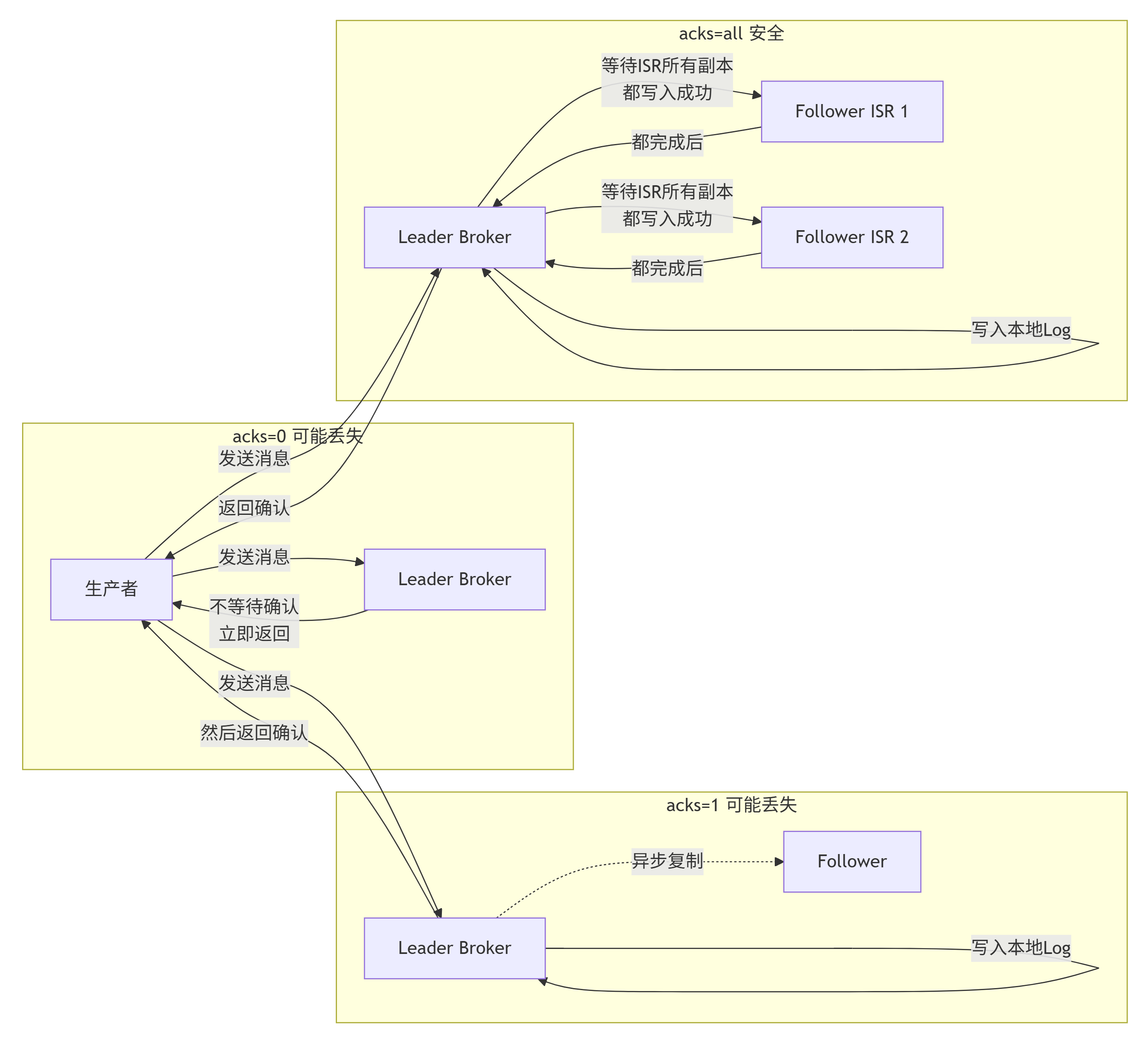 ●acks=all(或 acks=-1):最安全。生产者等待Leader收到所有ISR中的副本都成功写入消息后的确认。保证只要至少一个ISR副本存活,消息就不会丢失。