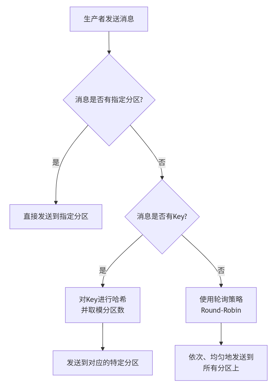 ②指定关键词(Key):为消息设置一个Key。Kafka会对Key进行哈希计算,根据哈希值与Topic分区数取余再决定分配到哪个分区。