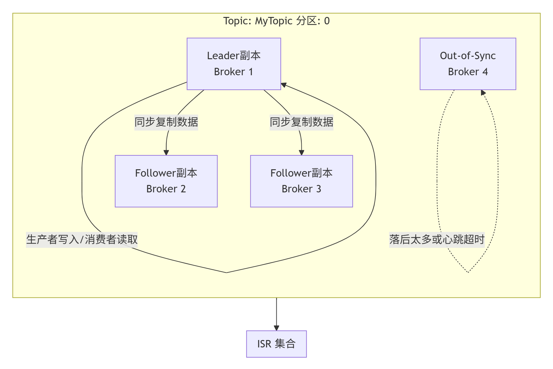 ●同步标准:Follower副本需要周期性地从Leader副本拉取消息,并保持一定的同步差距(由replica.lag.time.max.ms参数控制)。如果Follower落后太多或长时间未发起抓取(fetch)请求,就会被踢出ISR。