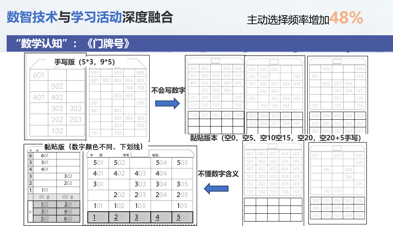 研究也形成了“技术开发-实践验证-迭代优化”的资源生态闭环。《门牌号》手写版→灰字版→剪贴版→灰底下划线版→双色数字版,每轮优化均基于幼儿操作数据(如错误类型、正确率),使资源更贴合教学需求。这种整合是基于幼儿认知特点的“经验联结”,符合维果茨基社会文化理论中“最近发展区”的交互性建构逻辑。