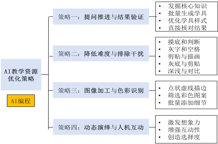 通过实际教学中幼儿的操作反馈和问题,课题组初步提炼出AI技术优化过程中的四个策略:包括“提问推进与结果验证”“降低难度与排除干扰”“图像加工与色彩识别”“动态演绎与人机互动”。