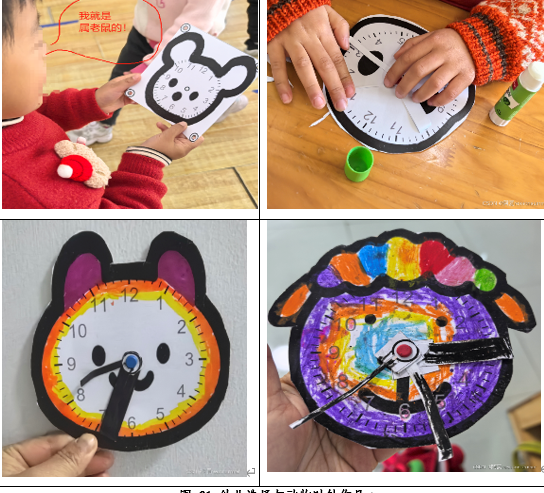 从课程结构来看,AI技术打破了学科边界的刚性划分,促进多领域经验的有机融合。实现“领域融合-经验联结-认知重构”的认知发展闭环。例如,《动物时钟》学具通过AI绘画将动物头像与时钟表盘结合,使数学认知(时间概念)、艺术表达(动物造型涂色)自然交织;“六只动物的故事”将美术拼贴与语言故事进行组合;《动物扇》中的手工制作与“风力实验”巧妙融合……形成综合性学习情境。