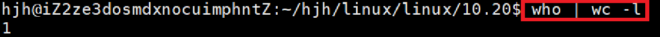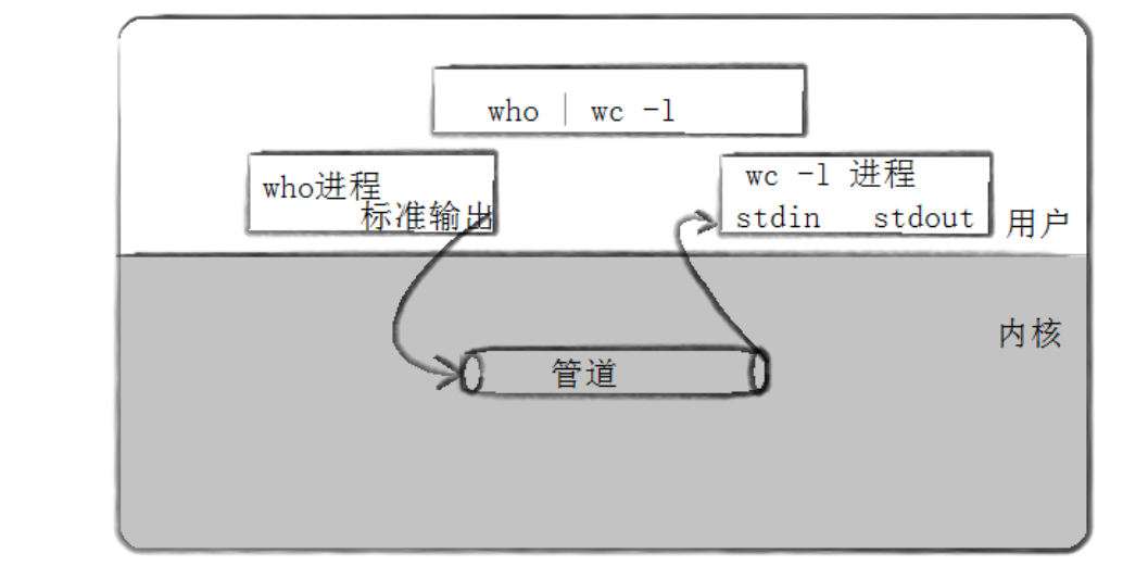 上图表示,将who进程输出的结果给到 wc -l 进程进行处理,然后输出对应输出。其中 “|” 就是管道。who 命令显示关于当前在本地系统上的所有登录用户的信息,而 wc -l 统计文本文件的行数
