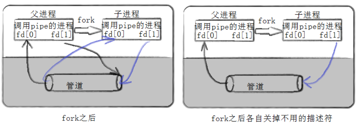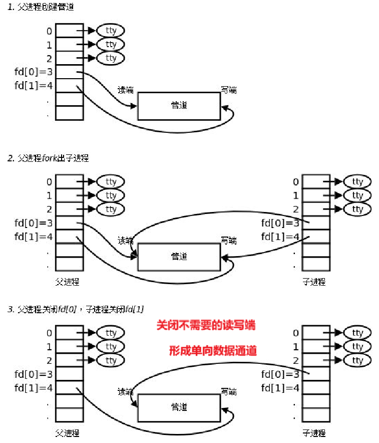 父进程中创建管道文件,给其分配两个文件描述符,然后父进程中在创建一个子进程,子进程的文件描述符和父进程相同。分别关闭父进程的读端和子进程的写端,就能形成一个父进程写,子进程读的通信信道。