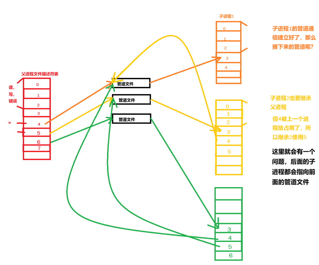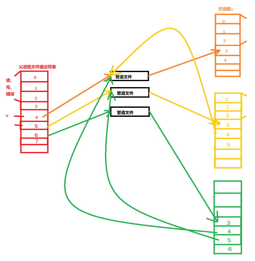 第一次父进程创建管道文件时,占用3,4 文件描述符,但是父进程为写端,所以关闭3号文件描述符,而子进程1关闭4号文件描述符;第二次创建管道文件时,因为4号文件描述符指向了管道文件1的写端,所以父进程占用3,5文件描述符,这是父进程3号文件描述符指向管道文件2的读端,4号文件描述指向管道文件1的写端,5号文件描述指向管道文件2的写端,创建子进程2时,子进程继承父进程的文件描述符表,所以将不要的文件描述符关闭之后,父进程的4,5号文件描述符分别指向管道文件1的写端和管道文件2的写端,但是子进程2的文件描述符表中,3号文件描述符指向管道文件2的读端,而4号文件描述符指向管道文件1的写端。同理,子进程3也一样。