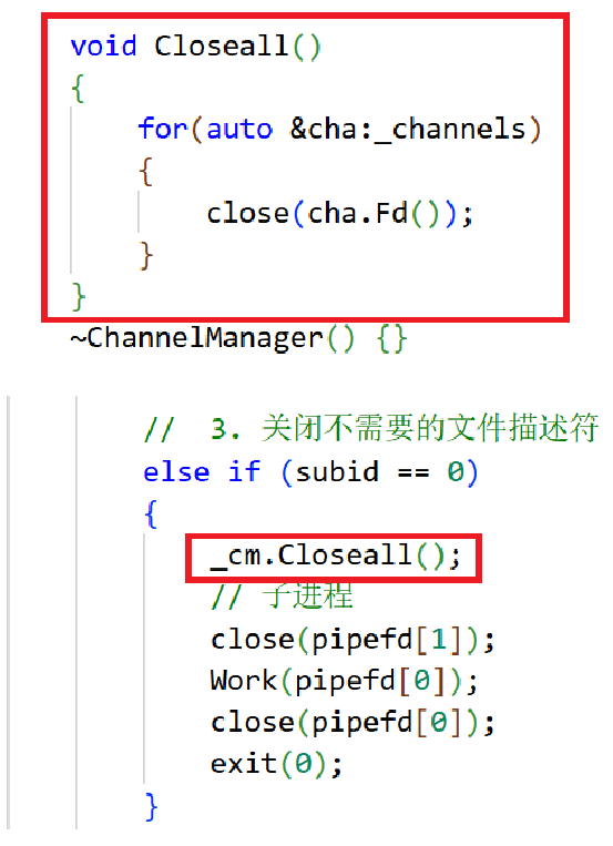 public:ChannelManager() : _next(0){}void Insert(int wfd, pid_t subid){_channels.emplace_back(wfd, subid);}Channel &Select(){auto &c = _channels[_next];_next++;_next %= _channels.size();return c;}void PrintChannel(){for (auto &channel : _channels){std::cout << channel.Name() << std::endl;}}void StopSubProcess(){for (auto &channel : _channels){channel.Close();std::cout << "关闭: " << channel.Name() << std::endl;}}void WaitSubProcess(){for (auto &channel : _channels){channel.Wait();std::cout << "回收: " << channel.Name() << std::endl;}}~ChannelManager() {}private:std::vector<Channel> _channels;int _next;