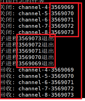 可以看到,这里循环分配任务结束之后,父进程关闭了指向管道文件写端的文件描述符,然后子进程从后到前依次退出,最后回收子进程程序结束。