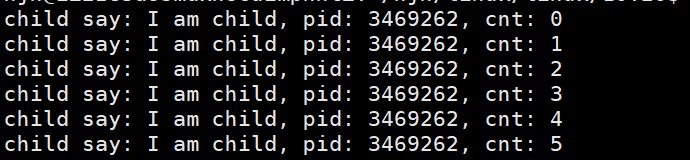 {char buffer[1024];int cnt = 0;while(true){snprintf(buffer, sizeof(buffer), "I am child, pid: %d, cnt: %d", getpid(), cnt++);write(wfd, buffer, strlen(buffer));sleep(1);}