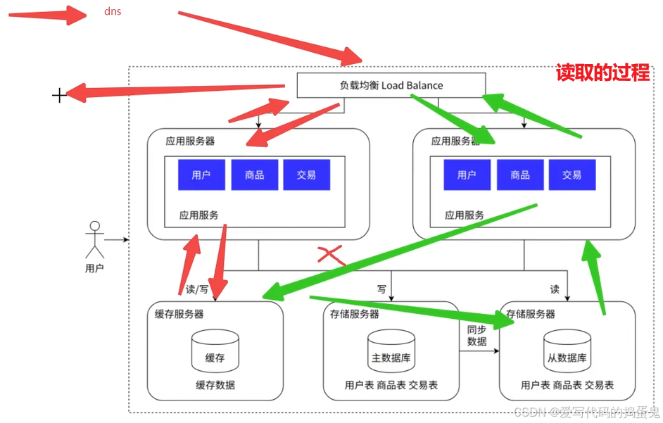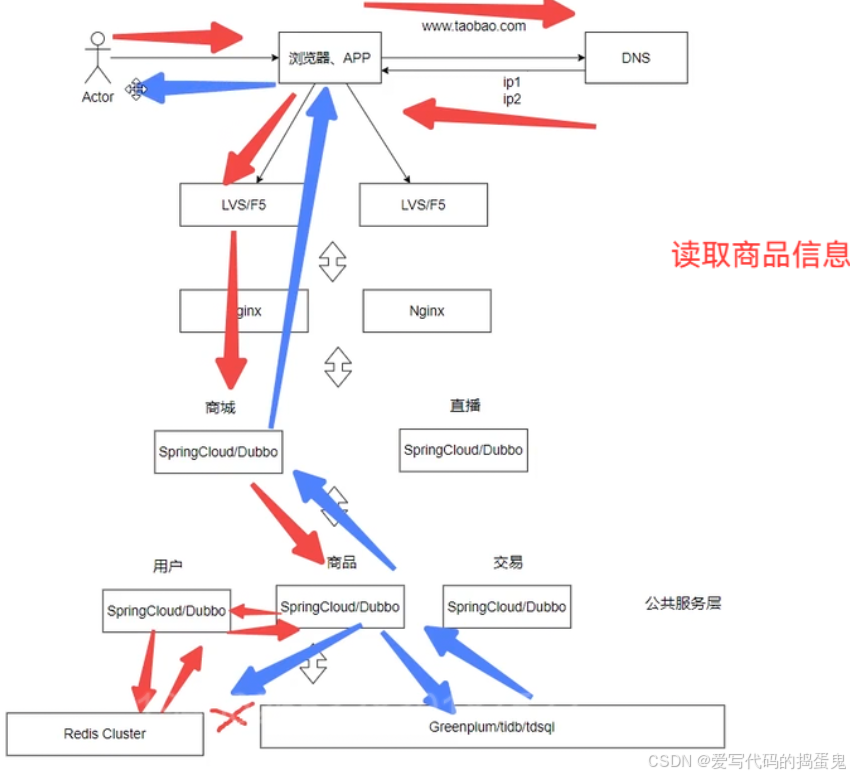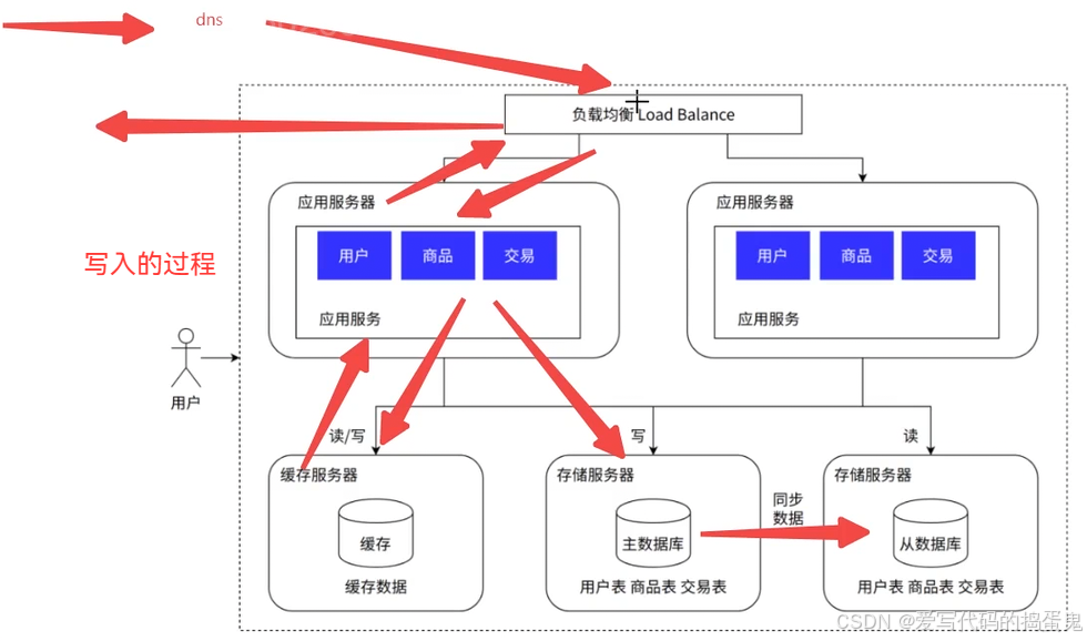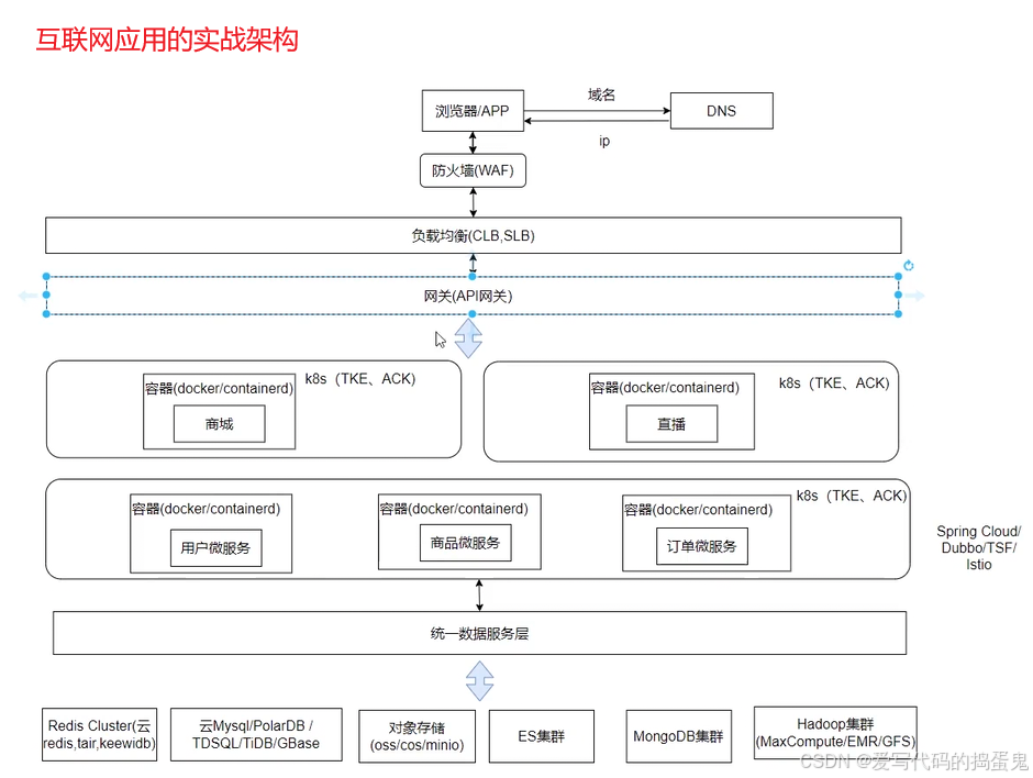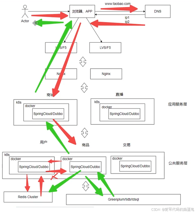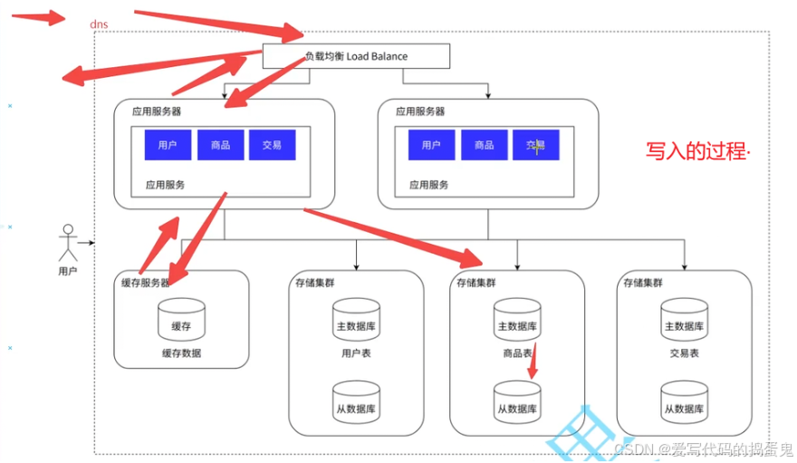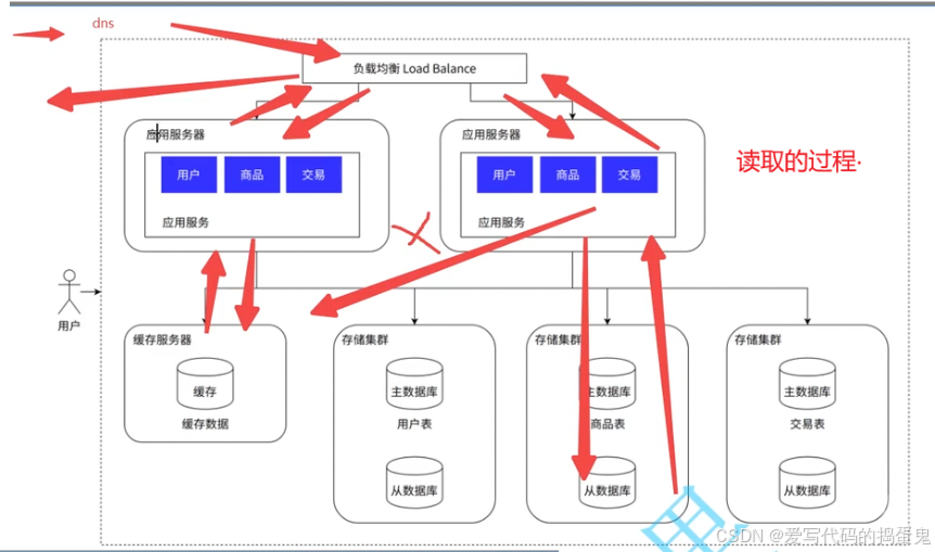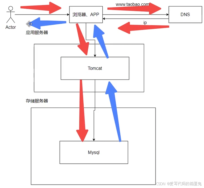 我们打开一个浏览器,访问这个网址,通过DNS获取这个网址的应用服务器的IP地址,抵达应用服务器后访问指定的应用服务,之后通过网络访问该功能的存储服务器的数据库,查到之后将数据返回给我们的应用。返回给用户。