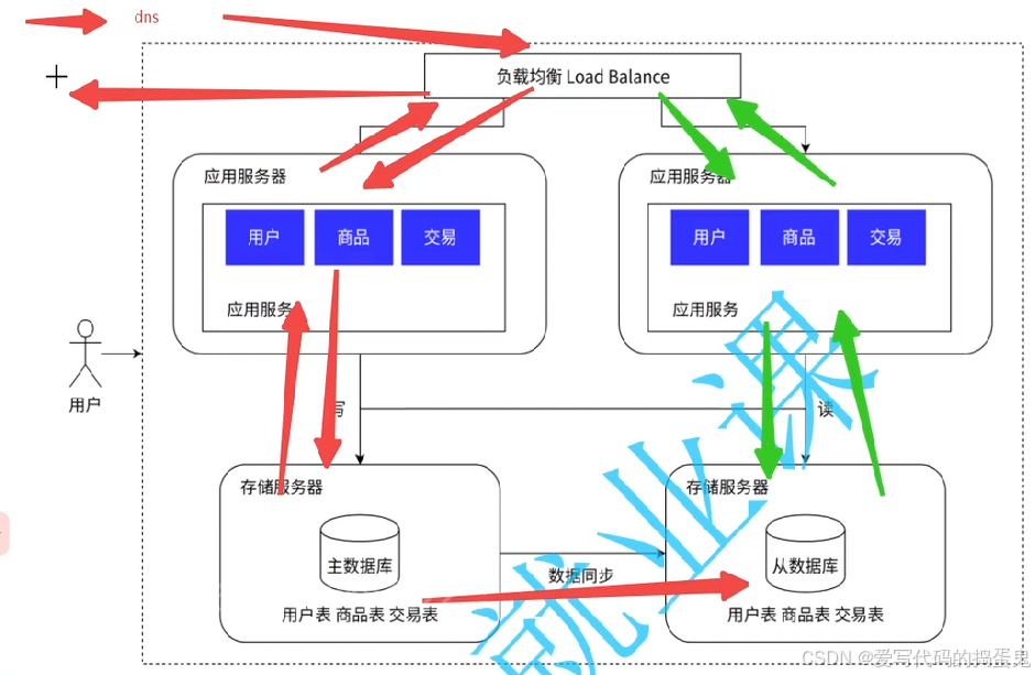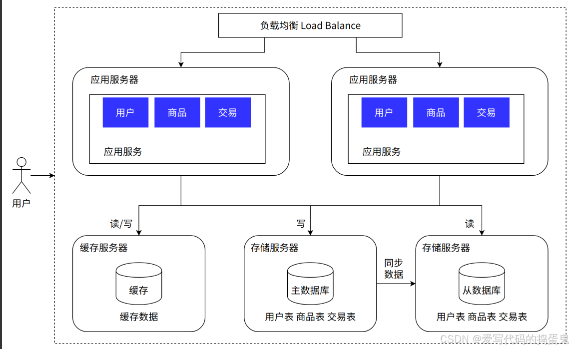 读写分离/主从分离架构:将数据库读写操作分散到不同的节点上,数据库服务器搭建主从集群,一主一从、一主多从都可以,数据库主机负责写操作,从机只负责读操作。