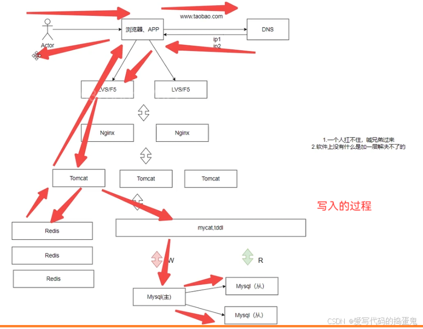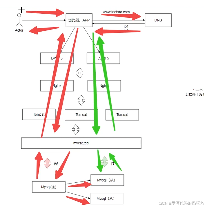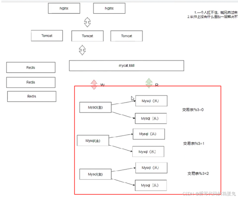 mycat, tddl组件(中间件层/中间层):当我们的读/写的流量来了,先到mycat, tddl 组件,该组件会检测这个流量到底是读还是写,当检测到是写的流量就访问Mysql主数据库服务器,写完之后就将写入后的数据同步给其他的写数据库服务器(从)。当检测到是读的流量就直接访问Mysql从数据库服务器。