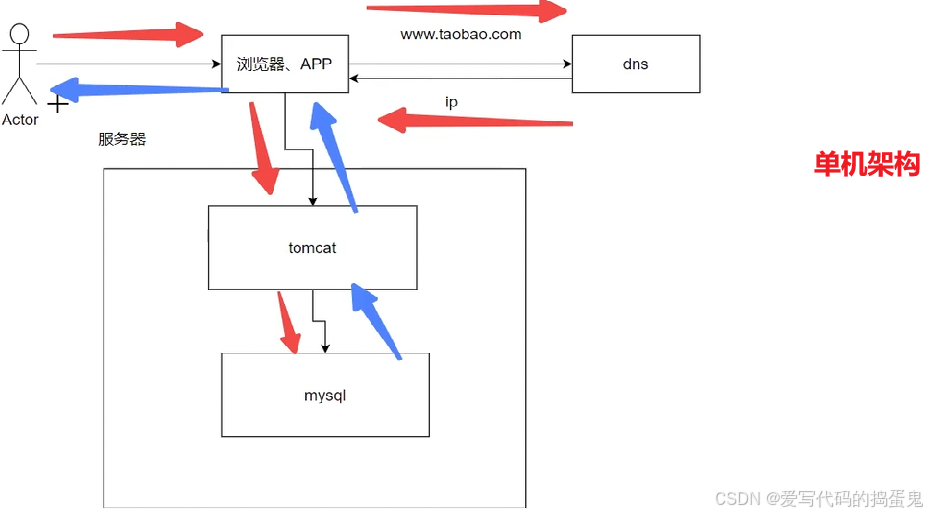 我们打开一个浏览器,访问这个网址,通过DNS获取这个网址的IP地址,因为我们上述蓝色的部分【用户、商品、交易等】都是我们写的代码功能,对外提供服务。所以也就是说,我们写的功能代码最终以 tomcat 组件的形式对外提供一个服务。即应用服务就是我们服务器的一个组件。故我们拿到了相应的IP地址并访问了指定的组件应用服务,之后到我们的数据库服务【MySQL等其他数据库】进行增删改查操作。操作完毕后将结果返回给用户。