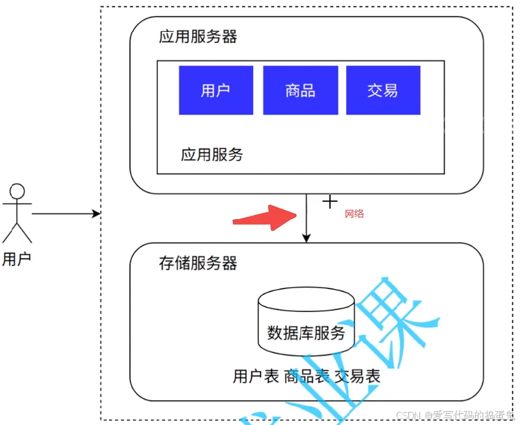 以电子商城为例,可以看到应用(划分了多个模块)和数据库在各自的服务器上通过网络协作完