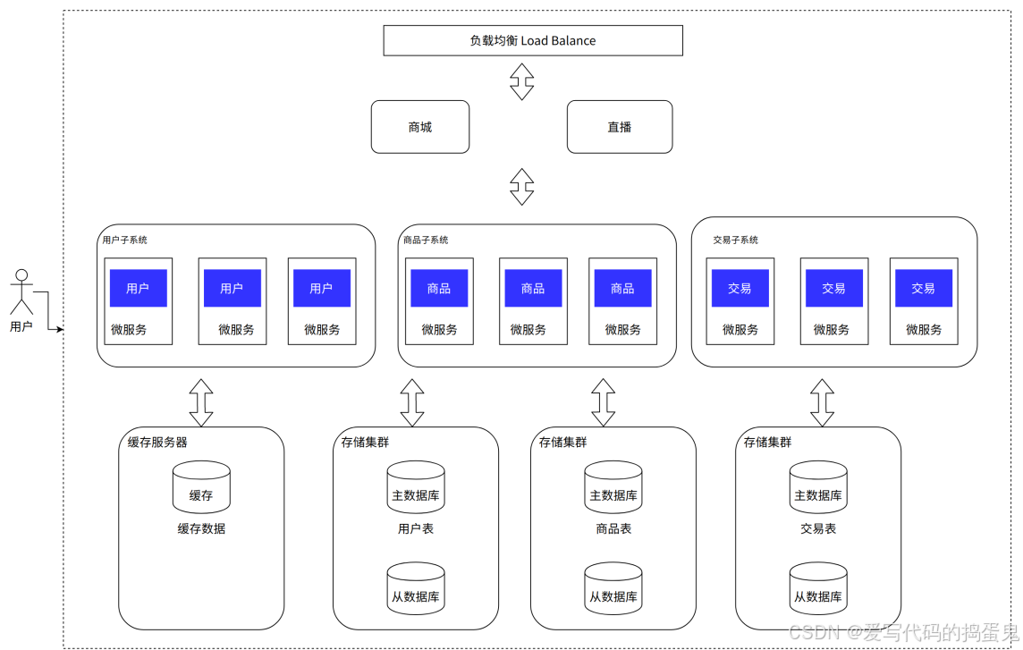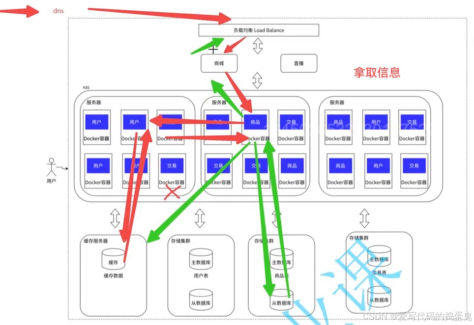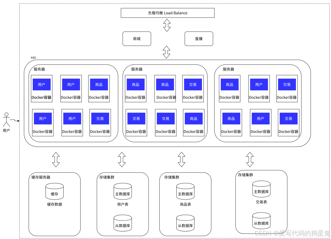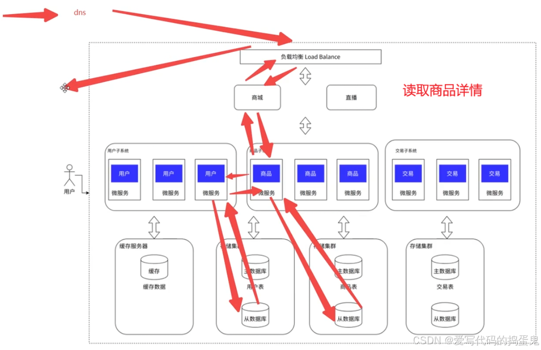 以电子商城为例,可以看到应用不再是一个,而是变成了多个,通过负载均衡来支持海量的并发。