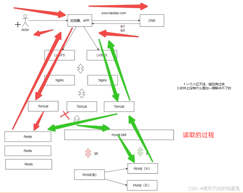 因为一个 Tomcat 应用服务最大可抗住1w个并发,假设来了很多很多的并发(>1w),引入负载均衡层【Nginx 、LVS/F5、等等】。一个Nginx负载均衡组件可以抗住5w级别的并发。若来了10w的并发则横向添加一个Nginx服务器,一次类推。但又假设来了50w的并发Nginx也扛不住了,则再引入一个负载均衡层LVS或者F5,LVS可以抗住几十万的一个并发,F5可以抗住几百万达至千万的一个并发。再次来个极端,来了上亿级别的并发,解决上一层"DNS",也就是说每当来了请求,返回的IP是依次访问不同的LVS/F5服务器。