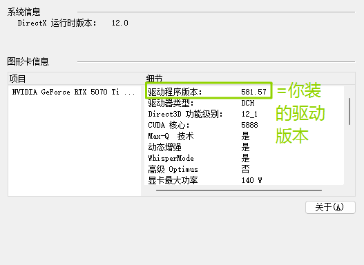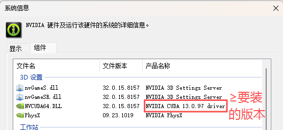 注意这里显示的驱动版本是你安装的版本,但是CUDA只是该驱动支持的最高版本,不是指你安装的CUDA,你只要装≤这上显示的CUDA版本即可