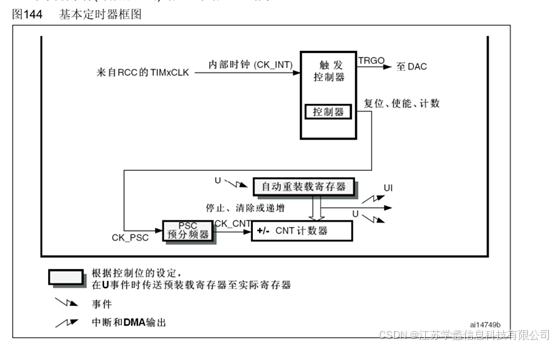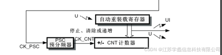 图中的三个是对于定时器最重要的部分,分别是预分频器、计数器和自动重装寄存器。它们构成了最基本的计数计时电路,所以这一块电路就叫做时基单元。