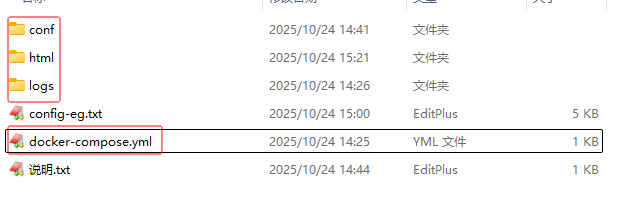 services:nginx:image: nginx:latestcontainer_name: nginxports:- "1234:80"- "1235:443"volumes:- ./conf:/etc/nginx/conf.d- ./html:/usr/share/nginx/html- ./logs:/var/log/nginxrestart: unless-stopped3.目录挂载准备