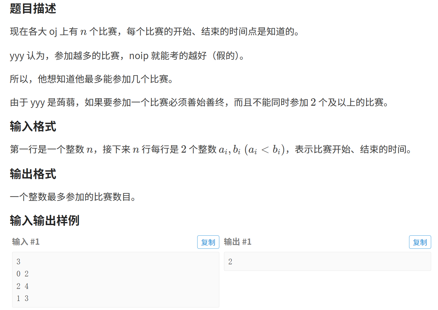 {cin >> n;for (int i = 1;i <= n;i++)cin >> a[i].left >> a[i].right;sort(a + 1, a + 1 + n, cmp);int cnt = 1;int r = a[1].right; //以第一个区间为基准,向后选择for (int i = 2;i <= n;i++){int left = a[i].left;int right = a[i].right;if (left < r) //重叠{r = min(r, right);}else{cnt++;r = right;}}cout << cnt << endl;return 0;