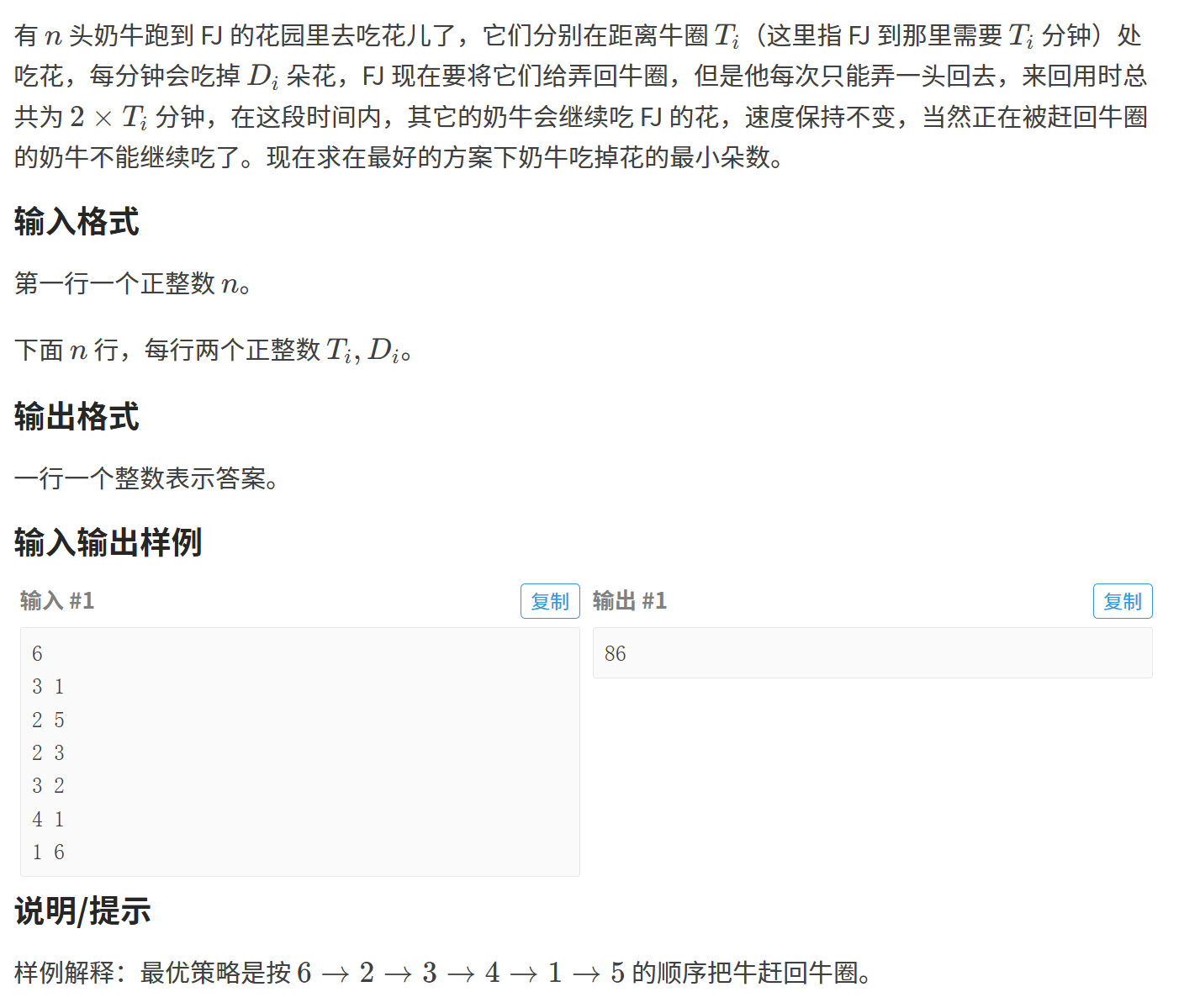 {cin >> n;for (int i = 1;i <= n;i++)cin >> a[i].t >> a[i].d;sort(a + 1, a + 1 + n, cmp);long long sum = 0, t = 0;for (int i = 1;i <= n;i++){sum += a[i].d * t;t += 2 * a[i].t;}cout << sum << endl;return 0;