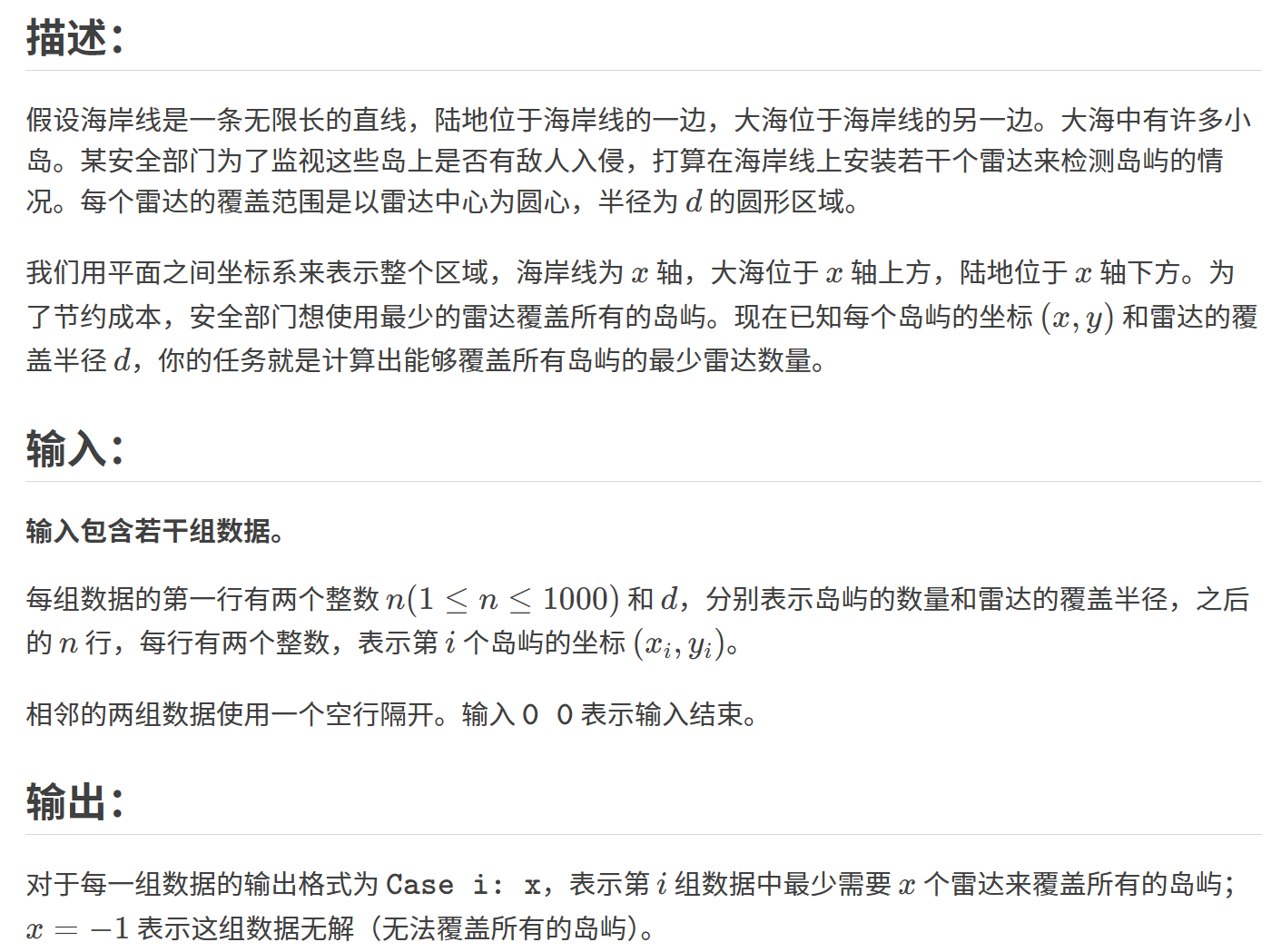 这道题如果直接在二维平面内分析的话会十分复杂,因为我们要枚举x轴上所有雷达的位置,然后计算每座岛屿到雷达的距离。所以第一步也是最关键的一步,就是把二维转化为一维。针对一座岛屿,当我们想要覆盖这座岛屿的时候,x轴上雷达的极限位置应该在哪一段区间内。第二步,在所有区间中,找出互相重叠的一共有多少组。先根据左端点排序,互相重叠的区间是连续的。当两个区间重叠时,应该用右端点较小的区间继续往后找。不重叠时,以下一个区间为基准,继续往后找。