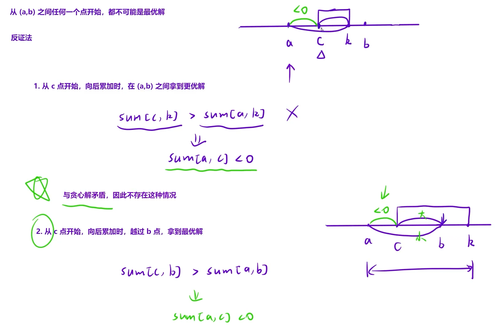 根据贪心的思想,我们希望sum ≥ 0,就继续向后累加;sum < 0,就舍弃这一段,从下个位置开始重新累加。