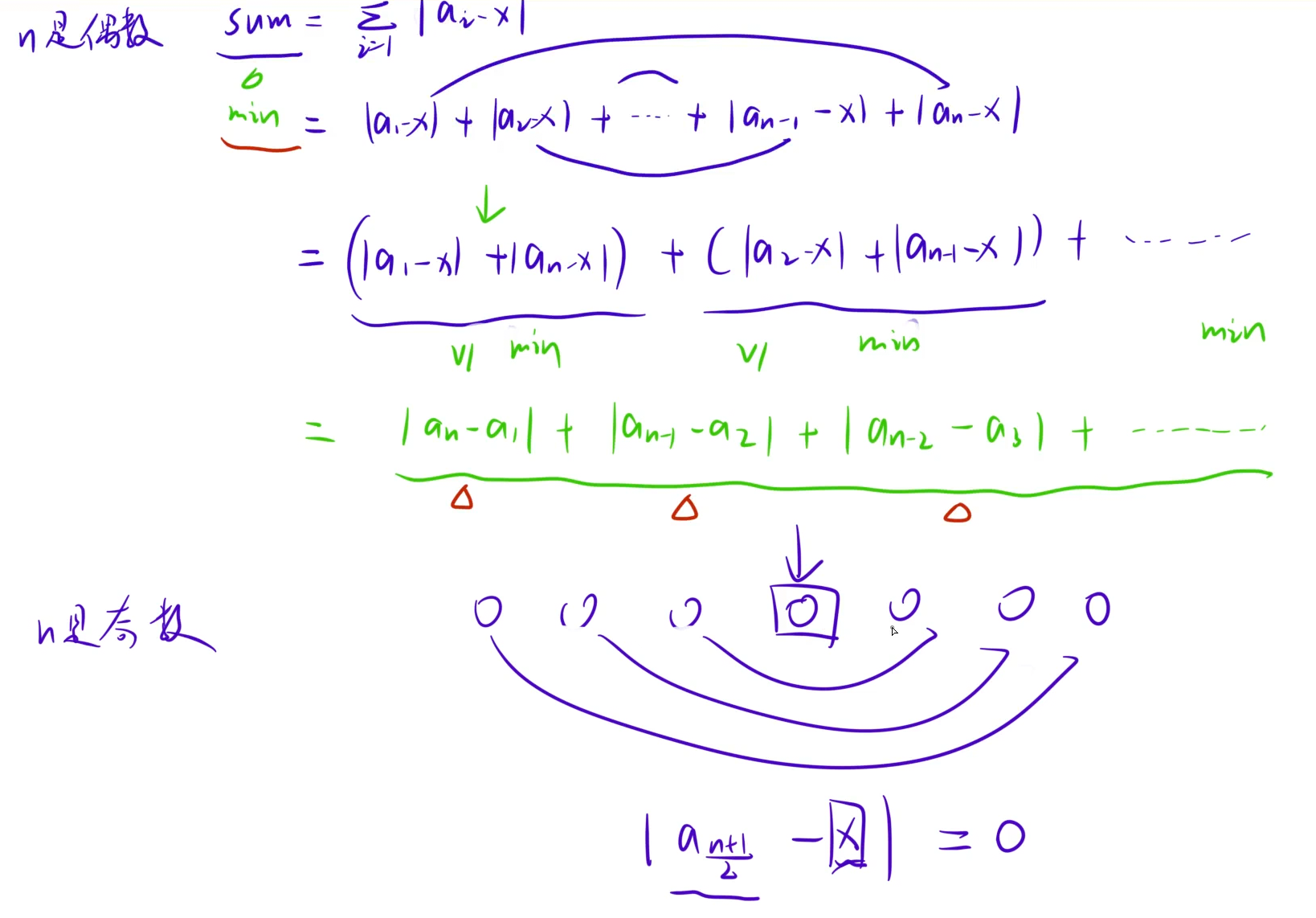 {cin >> n;for (int i = 1;i <= n;i++){cin >> a[i];}sort(a + 1, a + 1 + n);long long ret = 0;for (int i = 1;i <= n;i++){ret += abs(a[i] - a[(1 + n) / 2]);}cout << ret << endl;return 0;