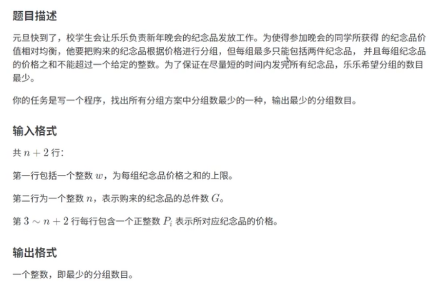 贪心策略:在剩余物品中,取出最小值x和最大值y,如果x + y ≤ w,就放在一起;如果x + y > w,就把y单独放,x待定。